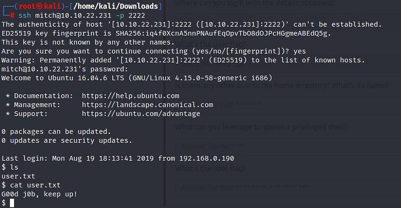 In the end, I successfully log into the system as the user “mitch” and obtain our first flag from the “user.txt” file!