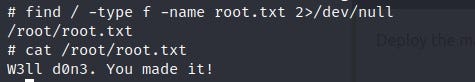 When I run the command, I elevate to the root user in the system. I use the “find” command to locate the “root.txt” file. The result: we obtain the root flag information!