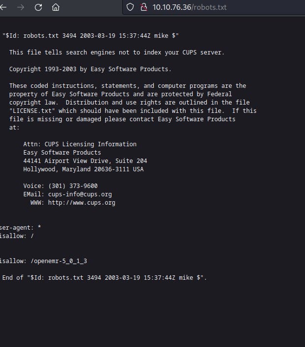We encounter the default page. Let’s check the robots.txt we found through the Nmap scan.