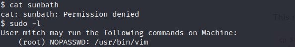While exploring the system further, I come across a file named “sunbath” but receive a “Permission Denied” error. To overcome this, I need to become the root user. I check if there is a sudo file I can use on the system using the “sudo -l” command.