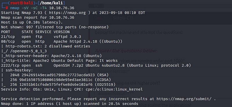 First, we begin with nmap scan. The -sV parameter stands for version, the -sC parameter stands for scripts, and the -T4 parameter represents speed.