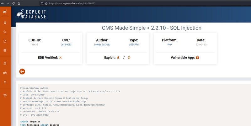 We obtain an SQL Injection exploit for the CMS. Let’s examine the exploit code.