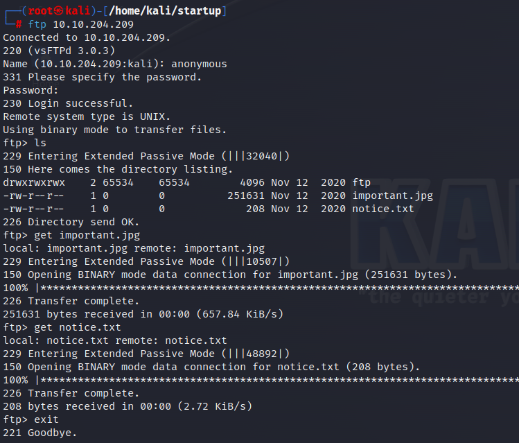 We log in with the username ‘anonymous’ and leave the password blank. Inside, we see a picture and a txt file. Let’s use the ‘get’ command to download them to our system.