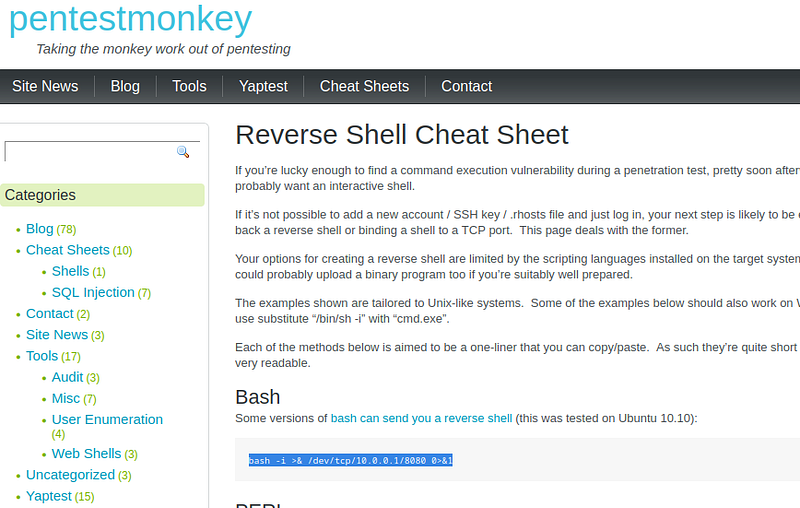 By changing the IP and port information of the bash code found on the pentestmonkey site according to our own, we write it into the file.