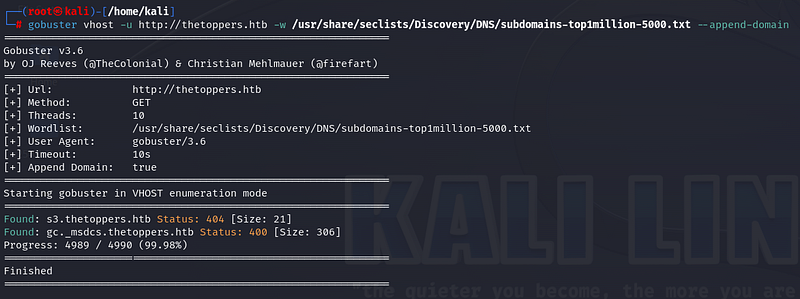 For advanced versions of Gobuster, if we don’t add “ — append-domain” at the end of the command, it won’t give us the desired result. When we run the command, we obtain the subdomain information that is useful for our purpose.