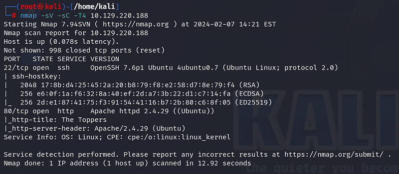 Firstly, we start with nmap scan. The -sV parameter is used for verbosity, -sC for scripts, and -T4 to specify the speed. According to the scan results, ports 22 (ssh) and 80 (http) are open.