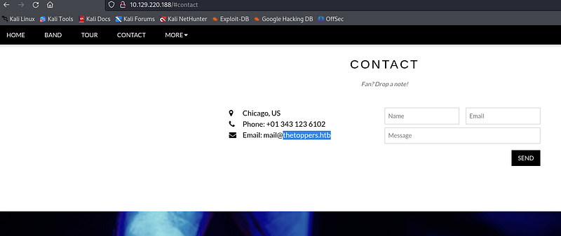 Let’s visit the website open on port 80. In the “Contact” section of the website, we find the domain information of the email address asked in the question.
