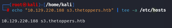 Let’s add the subdomain address “s3.thetoppers.htb” to the /etc/hosts file with a simple command.