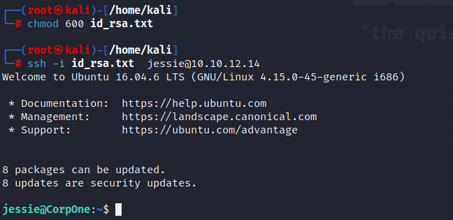 Then, using the previously found username and the “id_rsa” key information, we establish SSH connection.