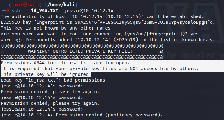 We encounter a warning here. Since the “id_rsa” key is private, it should not be accessible by others. Therefore, we change the permissions of our file.