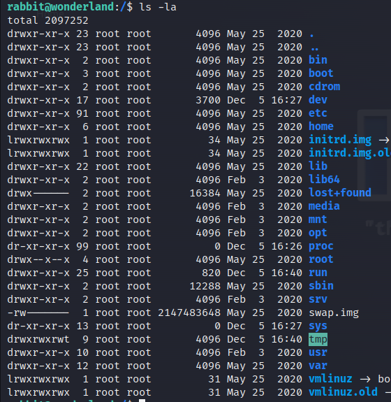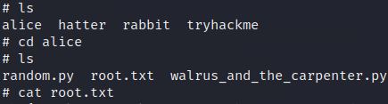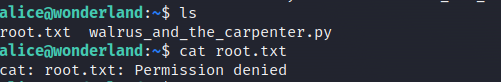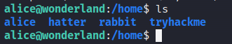 Let’s continue exploring the system. We see that there are also “hatter” and “rabbit” users outside of the Alice user, but we are not allowed to access them.