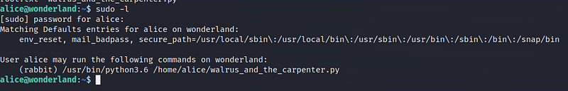 We can use the “sudo -l” command to check if we run files on the system with sudo privileges. According to this, the alice user can run the python file as the rabbit user.