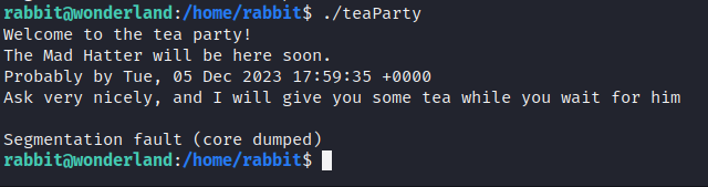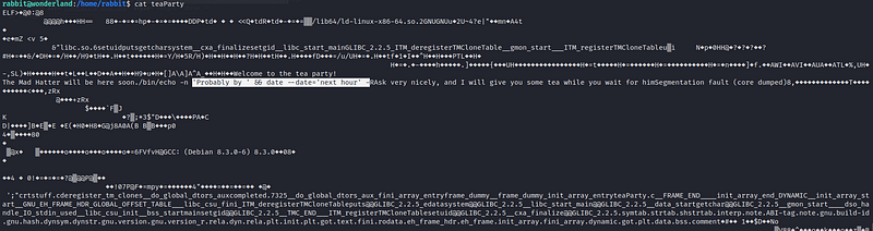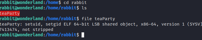 In the Rabbit directory, we see a file named “teaParty.” Looking at the type of the file, we learn that it is an executable file.