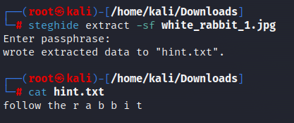 When we use the Steghide tool to inspect the images, we see that only “white_rabbit_1.jpg” contains hidden data. The message is “follow the r a b b i t.”