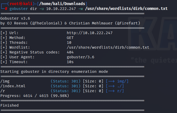 There is no information found on the website or in the page source. We can perform a directory search on the website using Gobuster. The /img and /r directories stand out in the results. Let’s examine them one by one.