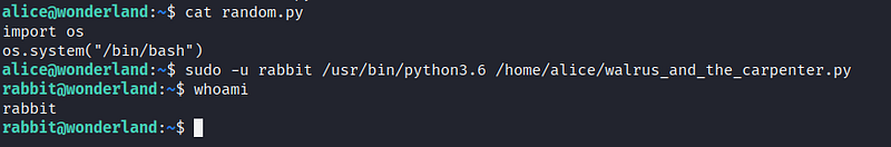 When we run the Python file as the rabbit user, we gain the rabbit user’s privileges.
