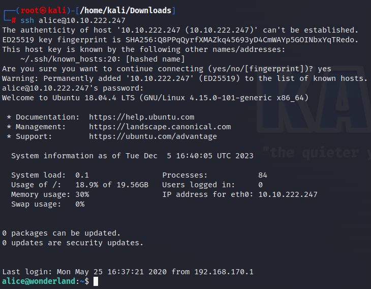 We obtain a password for the “alice” user from here. We will use this to make an SSH connection.