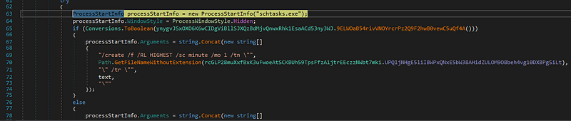 Xworm zararlısı bulaştığı sistemde kalıcılık elde etmek amacıyla scheduled task oluşturur. Yönetici haklarına sahipse en yüksek ayrıcalıklarla (/RL HIGHEST) her dakika olacak şekilde (/sc minute /mo 1) çalışacak bir görev oluşturur.