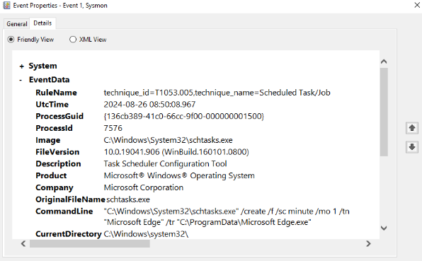 Zararlı yazılım çalıştırıldığında sonuçlar Sysmon ile incelenerek sistemde oluşturulan scheduled task dinamik olarak gözlemlenir.